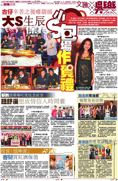 大S拍攝《保持通話》及進行宣傳,先後三度遇上颱風,前日也是冒風雨來港匆匆一天便返台灣,因她明日六號生日,妹妹、小S徐熙娣包起了一個電影院為她慶祝生日,並廣邀超過二百名親友齊來欣賞她的新作《保持通話》。前度男友「仔仔」周渝民可會到賀?大S表示仔仔工作很忙,應來不到了。至於生日禮物,她笑指還未正式到她生日,所以未收到。