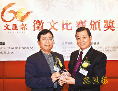 ■余秋雨出席本報六十周年報慶徵文比賽頒獎典禮,與社長張國良合照。