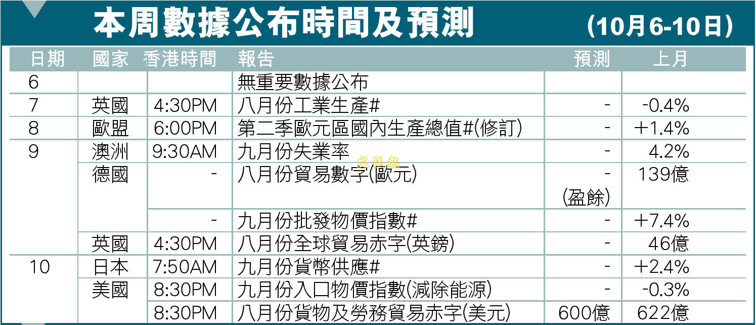 本周數據公布時間及預測(10月6-10日)