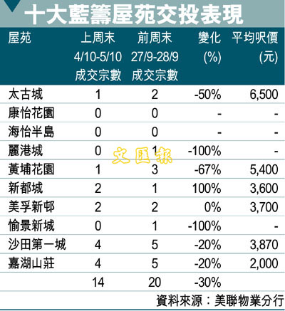 【本報訊】美聯物業旗下分行統計顯示,本港10大藍籌屋苑於剛過去的周末(10月4日至5日)僅錄14宗二手買賣成交,創有紀錄以來新低,更有機會低近03年沙士谷底水平。事實上,前一周(9月22日至28日)全港35個屋苑錄83宗成交,下試05年低位水平,而前周末10大藍籌屋苑錄20宗成交,上周末更再下挫3成,反映二手交投仍然在偏低水平徘徊。
