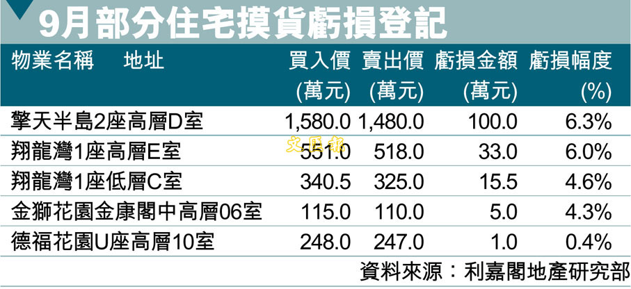 9月部分住宅摸貨虧損登記 (圖)