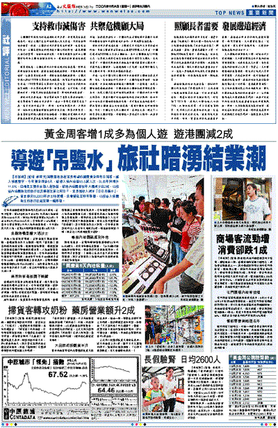 內地入境客錄得增長,主要由個人遊旅客帶動,香港旅遊業界人士都稱,雖然「後奧運」因素刺激內地客出遊,惟經濟環境轉壞、港澳簽證分家等因素都打擊他們來港意慾,入境旅遊接待協會與香港旅遊業議會都指出,今年內地訪港旅行團按年下跌兩成,由去年平均每日180團減少至今年150團。香港導遊總工會也表示,金融海嘯對導遊影響較03年的SARS還大,業界黃金周的工作比去年最少減少了3成,有工開的導遊收入也最少大減一半。