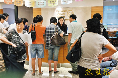■受AIG財困消息影響,大批AIA客戶一度申請退保。圖為客戶當日向職員查詢。 資料圖片