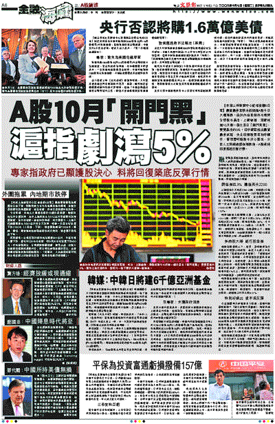 【本報上海新聞中心記者凌馨6日電】融資融券業務未能阻擋A股今日大幅補跌。由於內地長假休市期間全球股市暴挫,上證綜指、深證成指10月第一個交易日「開門見黑」,雙雙暴挫約5%。但中證監推出融資融券試點、央企回購股票等利好顯示,管理層呵護股市決心堅定,分析人士料經過節後補跌後,A股或將回復築底反彈行情。
