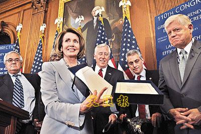 ■本月3日,美國國會眾議院通過總額達7000億美元的金融救援方案。圖為美國國會眾議院議長佩洛西(左二)展示已簽署的金融救援方案。