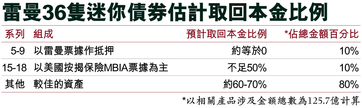 雷曼36隻迷你債券估計取回本金比例 (圖)