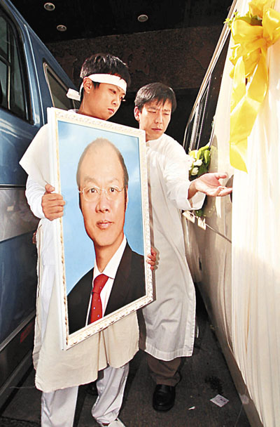 ■「金至尊」珠寶創辦人林世榮出殯,家人手捧其遺像送別。 本報記者潘政祁 攝