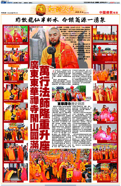 上午8時40分,升座儀式正式開始,東華禪寺鐘鼓齊鳴,萬行法師手執如意,在兩序大眾和諸山長老的簇擁下,緩步晉院,先後在山門、三門殿、大雄寶殿、法堂等處說法語偈。