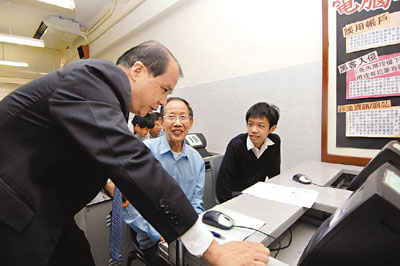 勞工及福利局局長張建宗探訪正在上電腦課的陽光長者學苑的長者與天主教普照中學的學生。