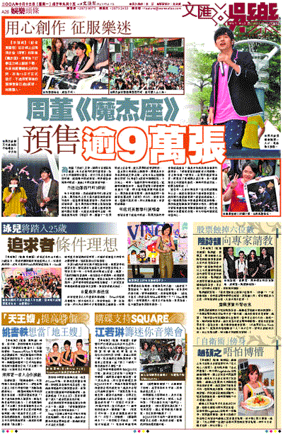 為回饋「杰迷」支持,繼前日出現在高雄後,昨日於西門町舉行簽唱會,為3千人的預購唱片簽名,吸引了來自各地包括韓國、波蘭等的歌迷到場,而排頭位坐輪椅的歌迷,更是3日前已經到場守候。
