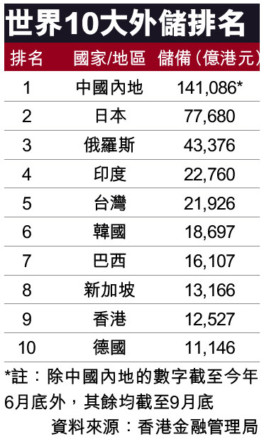 香港外儲全球排第九 (圖)