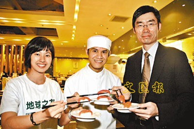 全港有12間日式連鎖食店、共140間店舖響應地球之友減用即棄筷子的呼籲,承諾1年內淘汰即棄筷子,堂食時轉用可多次使用的再洗筷子,其中包括元綠壽司、元氣壽司及吉野家等三大龍頭集團。圖為(左起)地球之友環境事務主任區詠芷、元綠壽司師傅和元綠市場及客戶經理車聲威,親身示範以再洗筷子吃壽司也很滋味。地球之友提供圖片