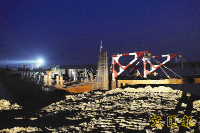 中方13日晚在黑龍江省撫遠縣七號界碑處,鋪設通往黑瞎子島的浮橋。 中新社