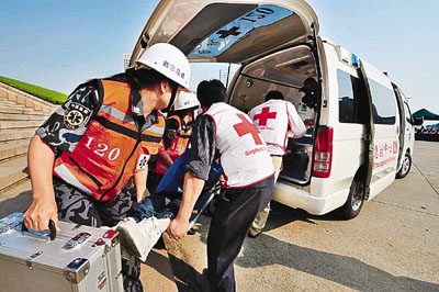 青島市機關大樓13日進行地震應急疏散演練。救援人員在緊急轉運「危重傷員」。 新華社