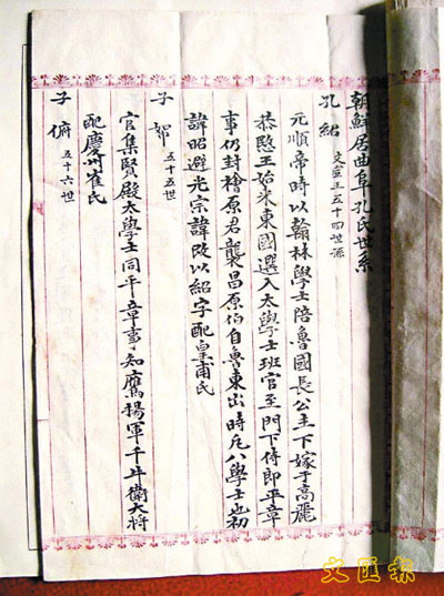 ■圖為孔子家譜支系之一的《居住朝鮮孔氏族人世系草稿》。 網上圖片