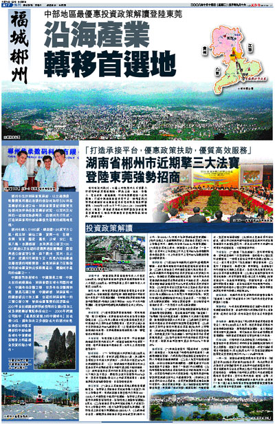 郴州市位於湖南省東南部,以交通便捷、毗鄰廣東和靠近港澳的優勢成為吸引沿海產業轉移的首選之地。湖南省委書記張春賢支持郴州加快承接產業轉移試點,以深圳及沿海的一些做法為參照系,由郴州先行先試,打造湖南省和中部地區優先發展的經濟增長極。