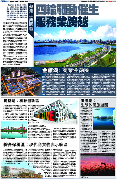 三年後的今天,流光溢彩、各類商舖林立的環金雞湖商圈;書聲琅琅、聚集了眾多高新技術產業研發項目的獨墅湖科教創新區;清新自然、獨具江南水韻的陽澄湖休閒度假區;功能齊全、代表超高效率和優質服務的現代物流綜合保稅區……人們僅僅靠眼睛就可以感受到,蘇州工業園區288平方公里的行政區域內,服務業正緊追製造業的腳步,三年裡一躍而上佔據了產業結構的又一主導地位。