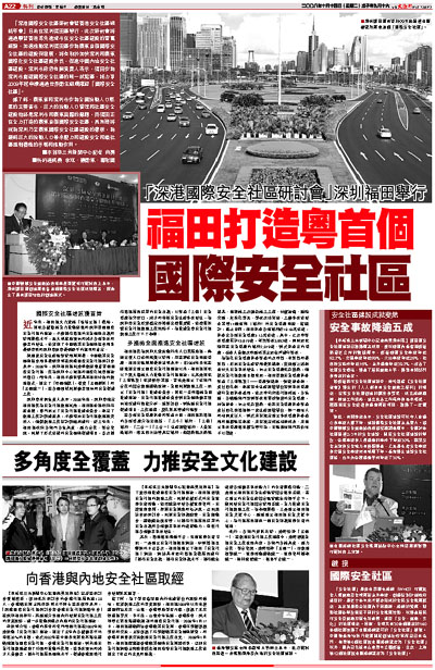 原國家安全生產監督管理局局長、中國職業安全健康協會理事長張寶明在深港國際安全社區研討會表示,2006年,深圳福田區開始爭創廣東省首個國際安全社區。作為深圳中心城區和國際化城市建設的窗口,兩年來,福田不斷探索具有福田特色的創建模式。提出了「四個確保」,落實「五個狠抓」和「五個統一」,在各個領域開展傷害預防和安全促進工作。
