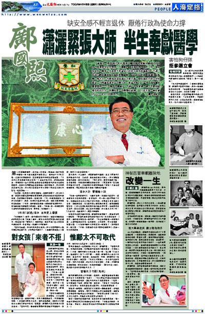 「當醫生,是因為50年代香港大學的醫科是獲英國認可的科目。其實我未必太熱衷、太喜歡。」這個年頭,為救人好,為名利也好,哪有一位家長不希望自己的孩子將來能當醫生。不過,年將74歲的養和醫院副院長鄺國熙,半百的光陰都「奉獻」給醫學,到今天,才輕描淡寫地道出不想行醫、厭倦醫院行政工作的想法,彷彿當初得來全不費功夫。那退休啦!「退休?我怕會耗盡積蓄呀……(下刪百字憂慮)」。不過,千言萬語,還不及跟他結婚多年的太太,對鄺院長一句精警的結語:「人在天堂,錢在銀行;心,在女人的胸膛。」