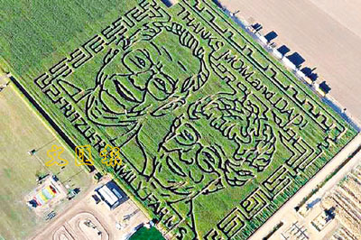 過去9年,美國農民格倫(Glen Fritzler)和妻子帕姆每年秋季都在粟米田上炮製一個迷宮,一直吸引許多遊客參觀。格倫今年為了表達對父親弗里茨勒和母親艾琳養育之恩的感謝,決定在粟米田中雕出父母的肖像。