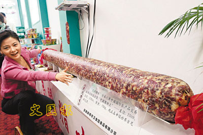 在第六屆中國國際農產品交易會的北京農展館內,一名市民在安徽展區參觀一根長238厘米、重70公斤的巨型臘腸。 新華社