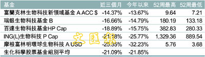 全球股市受到美國次貸及金融危機影響重挫,各產業指數均出現弱勢表現,連帶生物科技基金今年平均虧損也接近22%。以佔近三個月榜首的富蘭克林生物科技新領域基金為例,基金在2005、2006和2007年表現分別為3.44%、3.8%及-2.17%,基金平均市盈率和標準差為21.52倍及15.57。