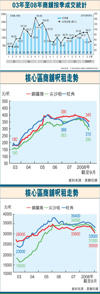 受環球金融海嘯衝擊,本港旅遊業及零售業受影響已陸續浮現。美聯工商舖指出,今年第3季商舖註冊量錄得自03年次季沙士後新低,僅錄得667宗,涉及註冊金額約51.49億元,分別較次季下跌33%及41%。核心區旺角及銅鑼灣售價按年跌幅近10%,租金按年跌約10%至20%。隨著未來市況持續下滑,估計年底前,核心區商舖租售價會再跌5%及3%,其中尖沙咀區商舖租售價跌幅最大,年底前分別會下挫5%與7%至8%。