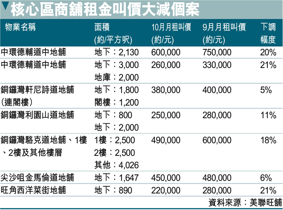 上季商舖交投跌3成 核心區租金跌10-20% (圖)