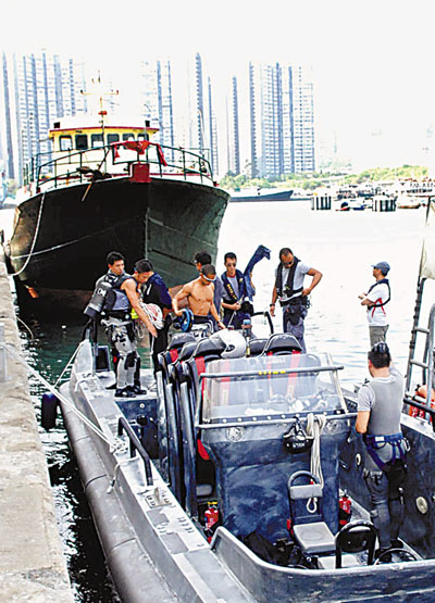 ■警方召水鬼隊從漁船的船底暗格內,起獲值500萬銀磚。本報記者溫瑞麟 攝