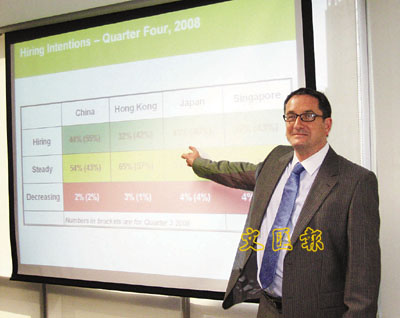 ■關偉鵬稱,受金融海嘯影響,有3%公司預期年底將裁員,包括銀行及金融服務、消費和資訊科技行業等。本報記者譚靜雯 攝