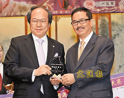 四洲集團戴德豐主席(左)頒發紀念品予粵劇發展諮詢委員會周振基主席。 本報記者劉國權 攝