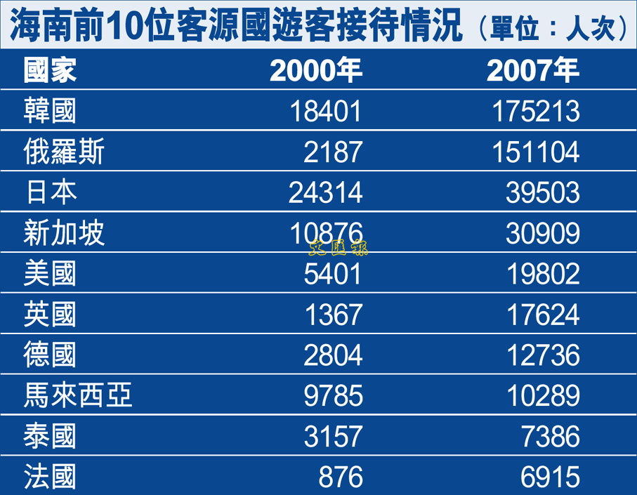 海南前10位客源國遊客接待情況(單位:人次)