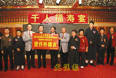 【本報訊】為了慰問四川地震災區長者,體現道教尊天敬老及濟物利人的精神,香港飛雁慈善敬老基金會昨日在四川成都誠信食府,舉辦「尊敬長者千人福壽宴」,宴請省內1千多名長者,向他們對社會畢生的貢獻致敬。往現場觀察的社會工作研究專家表示,慈善道教團體在當地舉辦敬老專題活動是首次,慈善敬老主題鮮明,相信會引起社會迴響。