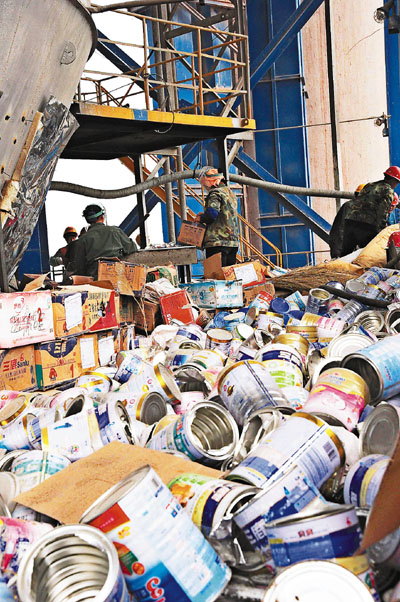 ■18日,在石家莊鹿泉鼎鑫水泥公司,工人們正在向窯爐搬運即將銷毀的問題奶粉。 新華社