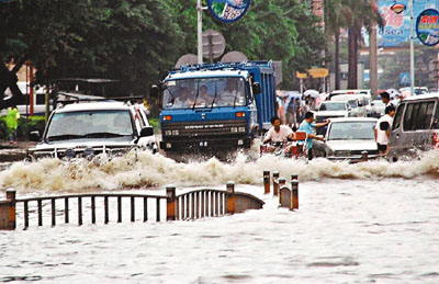 18日下午,海南三亞遭遇暴雨襲擊,近兩個小時的暴雨使得城區一些主要幹道頓時變成「河流」。 中新社