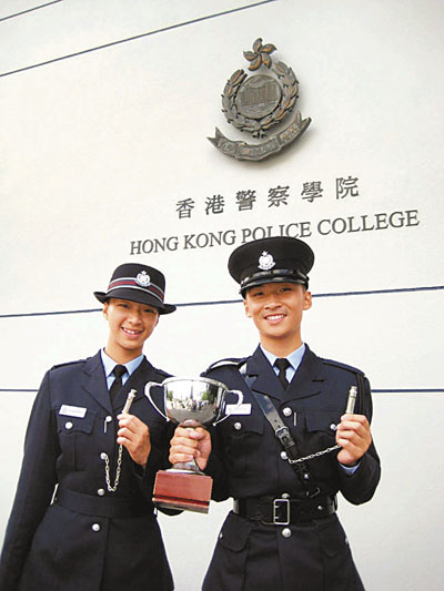 ■勇奪「薛富盃」及「銀笛」的韓競濤(右)表示,最想到刑事部門、重案組工作,發揮偵緝頭腦;右為奪得「銀笛」的杜泳雯。本報記者鄭佩琪 攝