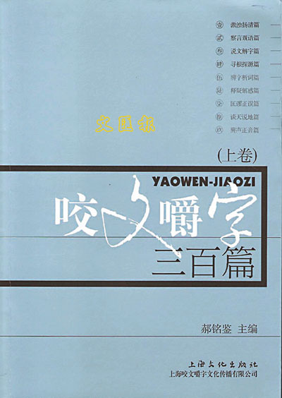 日前在內地書肆購獲一書,郝銘鑒主編的《咬文嚼字三百篇》(上海文化出版社,二○○八年七月)。書分上下兩冊,內容分為九大欄,包括〈激濁揚清篇〉、〈察言觀語篇〉、〈說文解字篇〉、〈尋根探源篇〉、〈辨字析詞篇〉、〈釋疑解惑篇〉、〈匡正謬誤篇〉、〈談天說地篇)、〈辨聲正音篇〉。將我們日常所用的錯字訛詞,引經據典,一一指正,包羅萬有,實是最佳工具書、知識書。這三百篇,全是擷自《咬文嚼字》這部雜誌。此誌在內地大為興旺,已大大打出了名堂。