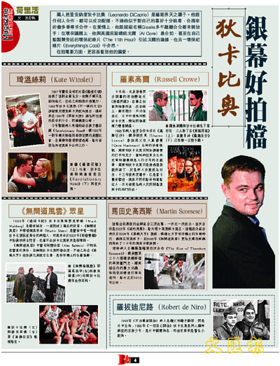 萬人迷里安納度狄卡比奧(Leonardo DiCaprio)是藝能界天之驕子。他跟任何人合作,都可以成功配搭,不過他似乎對自己的喜好十分執著,合得來的會多番尋求合作。在愛情上,他跟超級名模Giselle多年離離合合都未曾放手;在環保議題上,他與美國前副總統戈爾(Al Gore)最合拍,甚至在自己監製兼旁述的環保紀錄片《The 11th Hour》引述戈爾的論據,在另一環保紀錄片《Everything's Cool》中亦然。