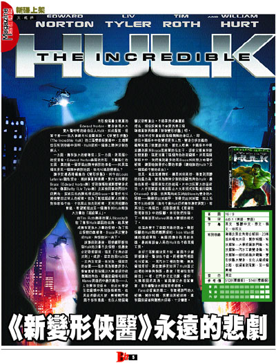 外形瘦弱書生氣重的Edward Norton,變身後是大大隻大聲咆哮的綠色巨人Hulk,如此配搭,相當不搭——但凡事總可以自圓其說。《新變形俠醫》(The Incredible Hulk)的三區雙碟版影碟中,主創單位在特別收錄中說明,Hulk就如一個患上精神分裂的病人。