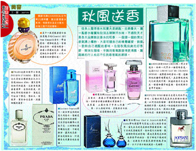 很多人覺得香水和夏天是絕配,炎熱暑天,灑一點香水確實有助消去陣陣汗水味。不過秋天才是各大品牌推出香水的旺季,一個接一個的男女香氛湧上櫃檯,大家可隨自己的嗅覺鍾愛,挑選一款和自己相配的香味。在這秋風送爽的好季節,輕抹在頸項、手腕的香氣散發得更清雅,讓路過的行人也忍不住找尋香氣的源頭。