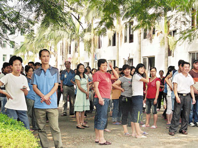 ■近百名工人在廠區門口等待會議的結果,未料資方根本沒有到會。 本報記者鄭海龍 攝