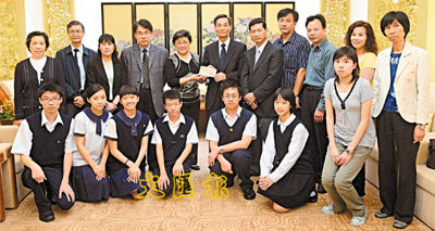 ■黃周娟娟代表福建中學3校和黃光漢獎學教育基金捐50萬元賑災,由中聯辦副主任黎桂康接收。
