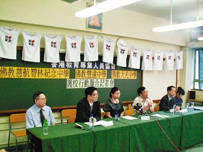大埔區的佛教慈航智林紀念中學、佛教大光中學、佛教慧遠中學及沙田區的崇蘭中學在06年中一收生不足,來年起其高中課程將不獲政府資助,有關學生可能被迫轉校。教協昨與前三間校舉行記者會,提出當局可改以「倒金字塔」式為學校提供資助。教協指,雖然有關學校中一收生較少,但擅於照顧第三組別及有特殊需要學生,所以很受新移民及轉校學生歡迎,學生人數和班數會如「倒金字塔」式遞增,當局應考慮按其中二、中三及更高年級的實際人數提供資助,而非硬性規定以中一人數計算。