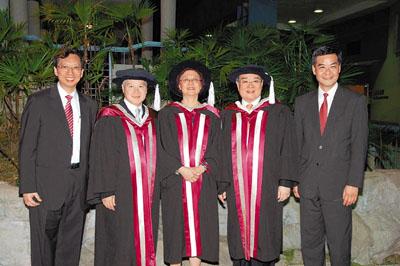 嶺南大學昨日舉行「第38屆學位頒授典禮」,由校董會主席梁振英向3位社會傑出人士郭少明、鄭慕智及劉瓊鳳頒授榮譽博士。同時,嶺大亦向今年1,091名本科、深造文憑、碩士及博士畢業生頒授學位。校長陳玉樹亦特別勉勵一眾畢業生,面對目前環球金融危機,嶺大將以博雅教育的優良傳統,幫助學生衝破障礙,在困境中突圍而出。(右起)梁振英、鄭慕智、劉瓊鳳、郭少明及陳玉樹。 嶺大提供