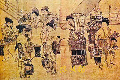 《茗園賭市圖》鬥茶圖(此畫在台北故宮博物院)。此畫以人物為主,畫面上人物不少,畫中茶販有注水點茶的,有提壺的,有舉茶杯品茶的。右前邊有一挑茶擔賣茶小販,停肩觀看,還有一婦人一手拎壺另一手攜小孩,邊走邊看鬥茶。此畫中有男人、女人,老人、壯年、兒童,人人有特色表情,眼光集於茶販們的「鬥茶」,個個形象生動逼真,把宋代街頭民間鬥茶的情景淋漓盡致地描繪在世人面前。