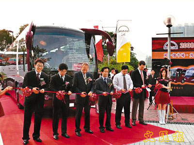 德國「猛獅」(MAN)豪華巴士的本港代理商合德汽車有限公司,日前在沙田明星海鮮舫舉行大型車展,展出的巴士多達10輛,泊滿了整個畫舫的停車場,當中以剛贏得歐洲最佳客車殊榮的「獅子皇」(Lion King)最矚目,優美的線條吸引來賓的目光。原來這款巴士並非全在歐洲打造,而是透過廠方與河南「宇通」車廠合作的成果,除了底盤和引擎原裝來自德國,其他部件及裝嵌工序都在河南進行,但在場來賓都讚歎造工精細,足以媲美歐洲進口產品。