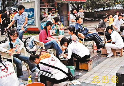■合川塔耳門廣場,重慶大學生以擦皮鞋的方式為身患腦癌的康麗同學募捐。 網上圖片