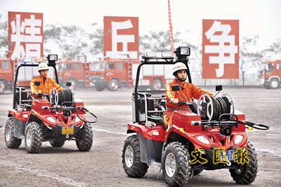 23日,一種新型四輪消防摩托亮相山東濟南。這種四輪消防摩托車機動靈活、方便快捷,並配備高效細水霧滅火裝置,提供泡沫和微滴兩種滅火形態,為狹街窄巷、車輛密集的城市小區的消防搶險救援提供了全新保障。新華社