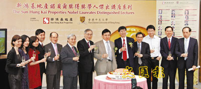 「新鴻基地產諾貝爾得獎學人傑出講座系列」踏入第5年,已成為本港學術界一年一度之盛事。為慶祝舉辦5周年,新地和中大昨日在新鴻基中心舉行慶祝會,新地副主席兼董事總經理郭炳聯、中大校長劉遵義出席儀式。