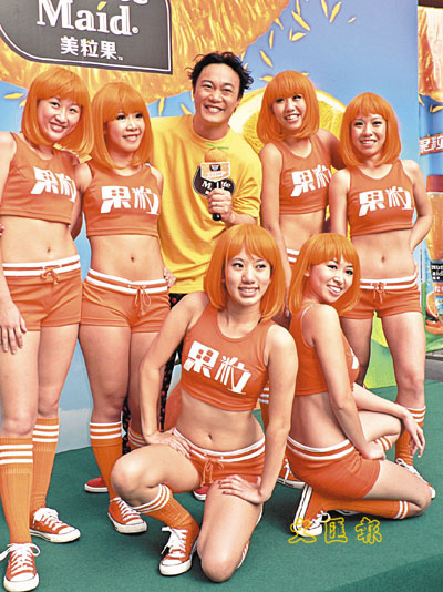 【本報訊】(記者 李思穎)陳奕迅昨日為代言的果汁在銅鑼灣鬧市宣傳,大會安排多位工作人員戴上陳奕迅紙板面具大派果汁,又特意安排幾位穿上露臍短褲的女模特兒大跳熱舞,並簇擁陳奕迅合照,陳奕迅打趣表示已有30多年沒有試過這麼好的艷福,他對這次酬勞亦感滿意,又會獲得贊助飲果汁,女兒康堤都會受惠。